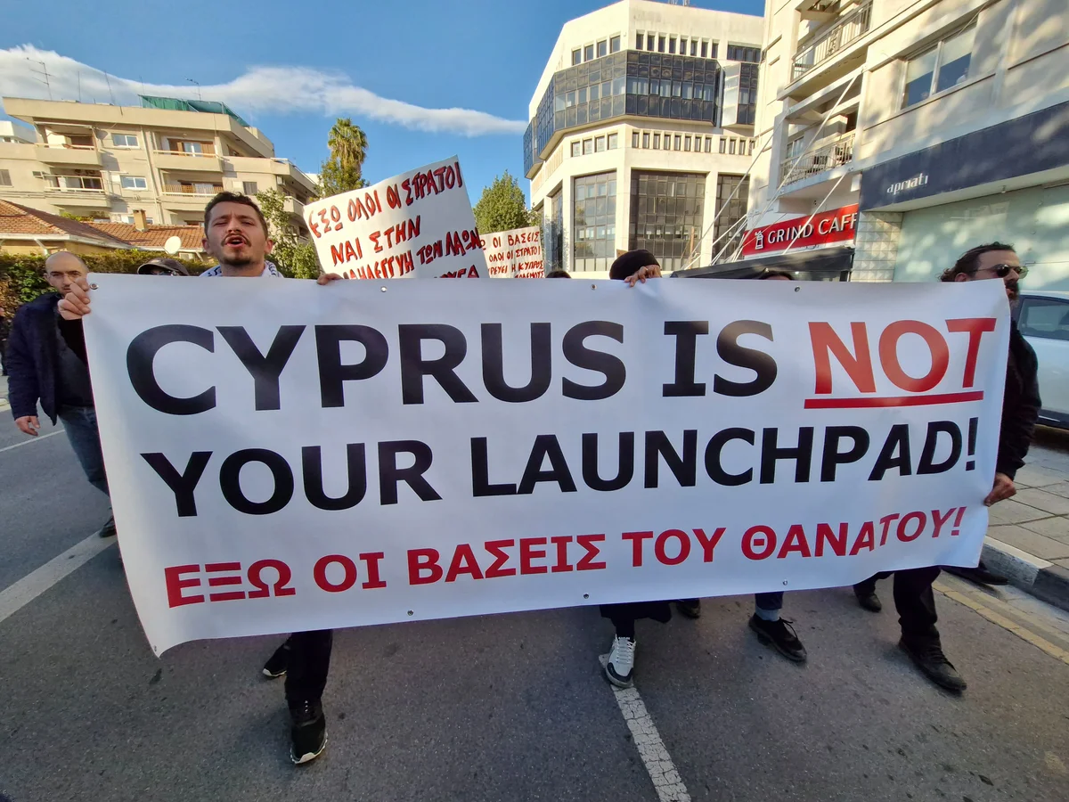 Göstericiler, Cumhurbaşkanlığı Sarayı'na doğru yürüyüş gerçekleştirirken "Ölüm üsleri dışarı" sloganları attı. Eylemciler, Kıbrıs'ın İran ile daha geniş çaplı bir çatışmanın içine sürüklenebileceği endişesini dile getirdi.