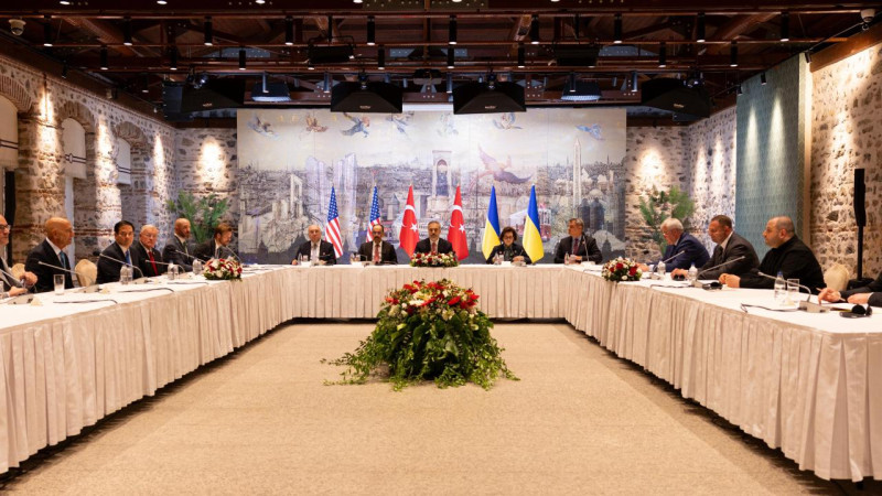 Dışişleri Bakanlığı kaynaklarından edinilen bilgiye göre, Türk, Amerikalı ve Ukraynalı heyetler, Dışişleri Bakanı Hakan Fidan'ın başkanlığında İstanbul'daki Cumhurbaşkanlığı Dolmabahçe Çalışma Ofisi'nde bir araya geldi.