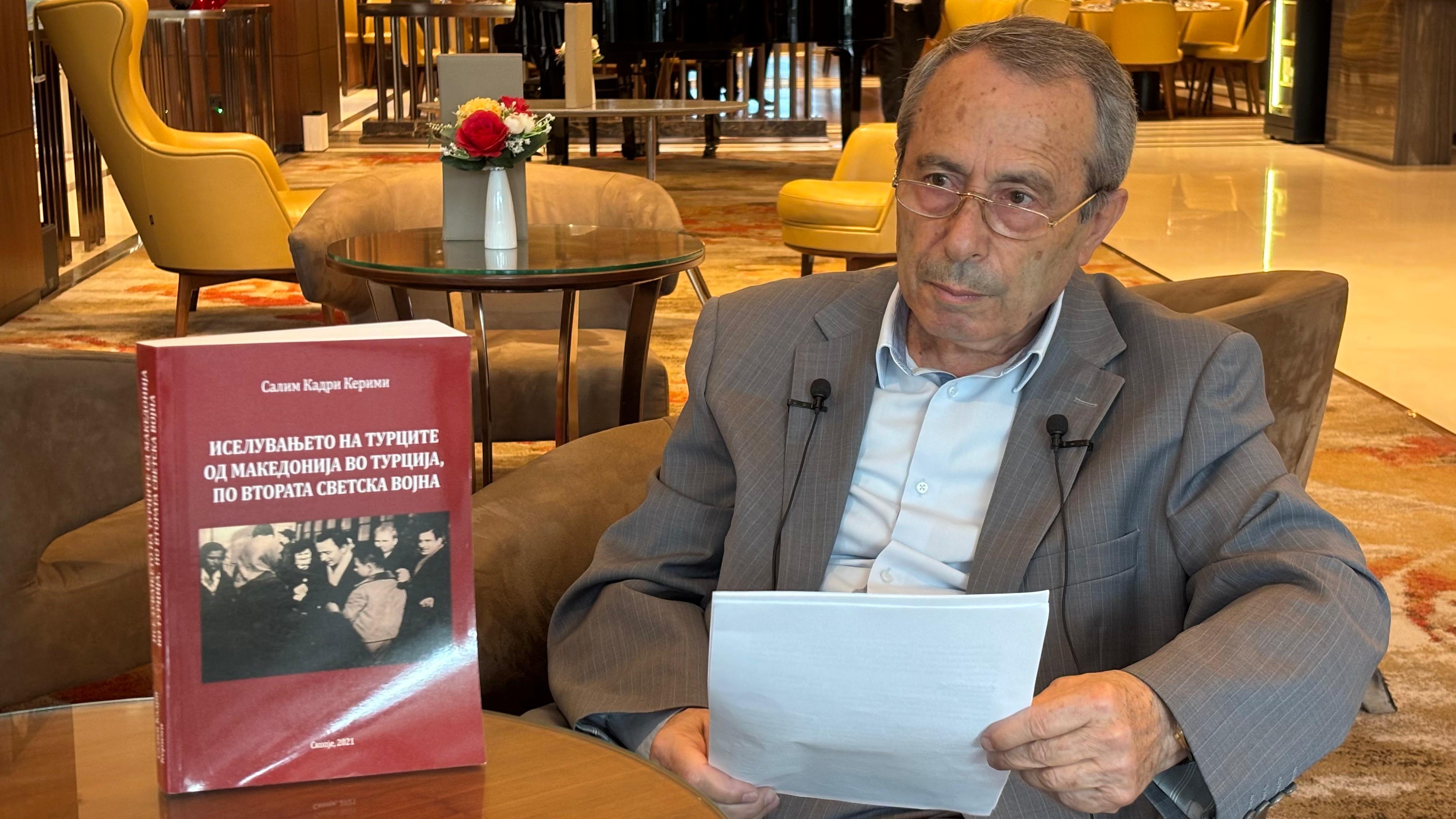 Salim Kadri Kerimi: Evet. Makedonya’da geçmişte bu meseleyle ilgili tek bir kitap yazılmıştı, o da Arnavutça olarak. Yazarı tarihçi Sayın Kerim Lita, yalnızca Arnavutların göçüyle ilgilenmiş ve biz Makedonya Türkleri hakkında ve onların göçüyle ilgili maalesef çok yanlış bilgiler, varsayımlar ve sonuçlar sunmuştu.