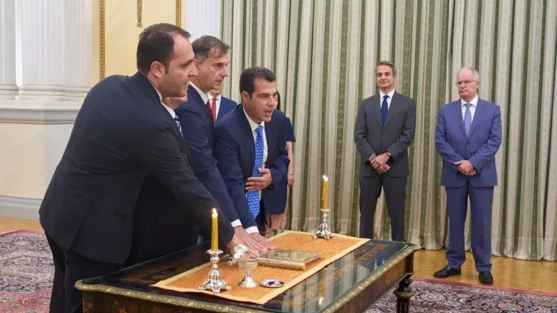 Cumhurbaşkanlığında düzenlenen törende, EPPO'nun başlattığı yolsuzluk soruşturması nedeniyle kabineden istifa eden bir bakan ve üç bakan yardımcısının yerine Başbakan Miçotakis'in görevlendirdiği dört kişi yemin ederek işbaşı yaptı.